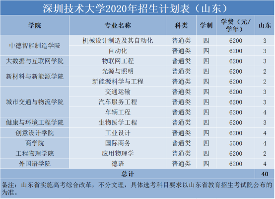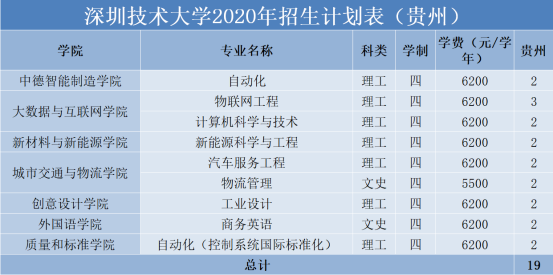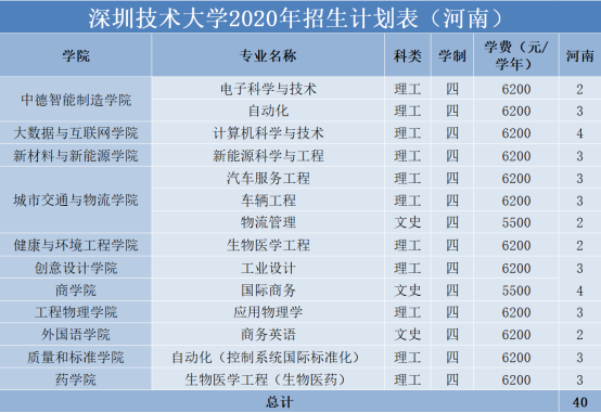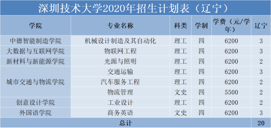 表4:深圳技术大学2020年招生计划表(辽宁)