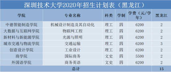 表3:深圳技术大学2020年招生计划表(黑龙江)