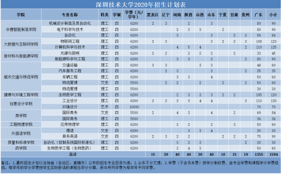 深圳技术大学2020计划面向广东、黑龙江、辽宁、河南、陕西、山西、山东、宁夏、甘肃、贵州等十省招生,计划招生1600人。在广东省,学校录取批次为本科批次,其他省(区、市)文科类、理科类列第一批(重点批或本科批)录取。具体的专业方向和招生人数见下方表格。
