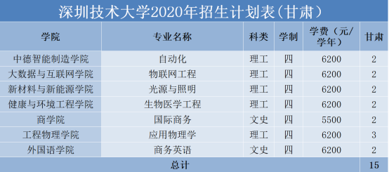 表10:深圳技术大学2020年招生计划表(甘肃)