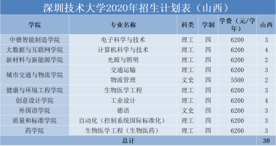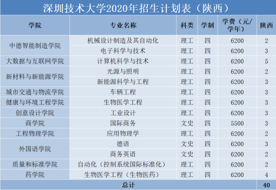 表9:深圳技术大学2020年招生计划表(宁夏)