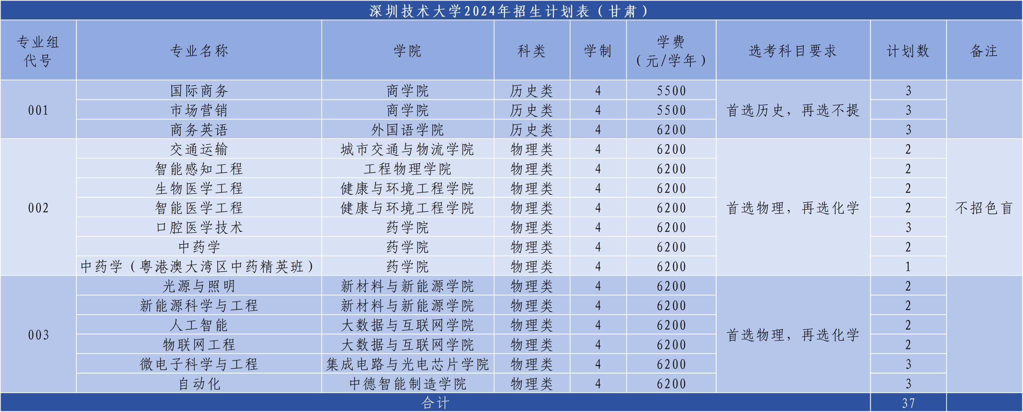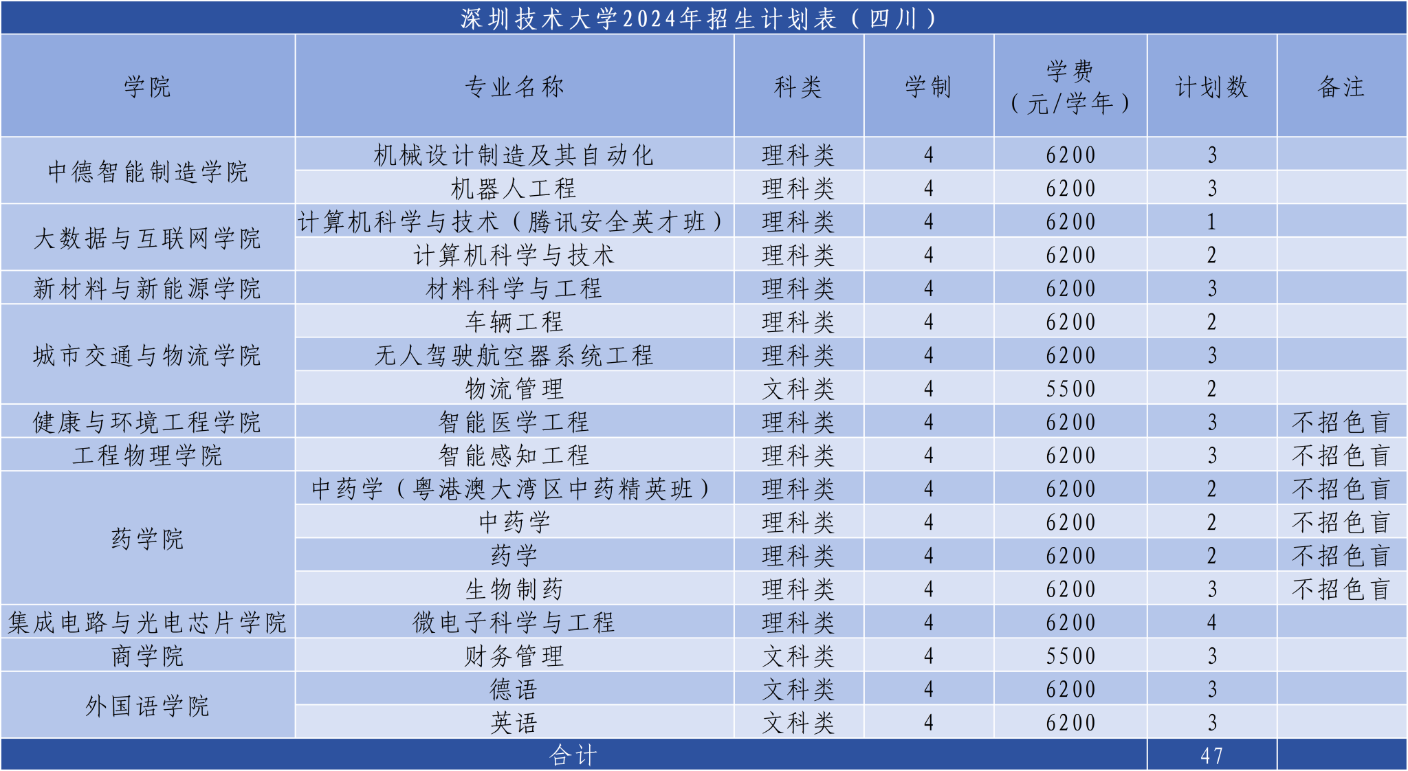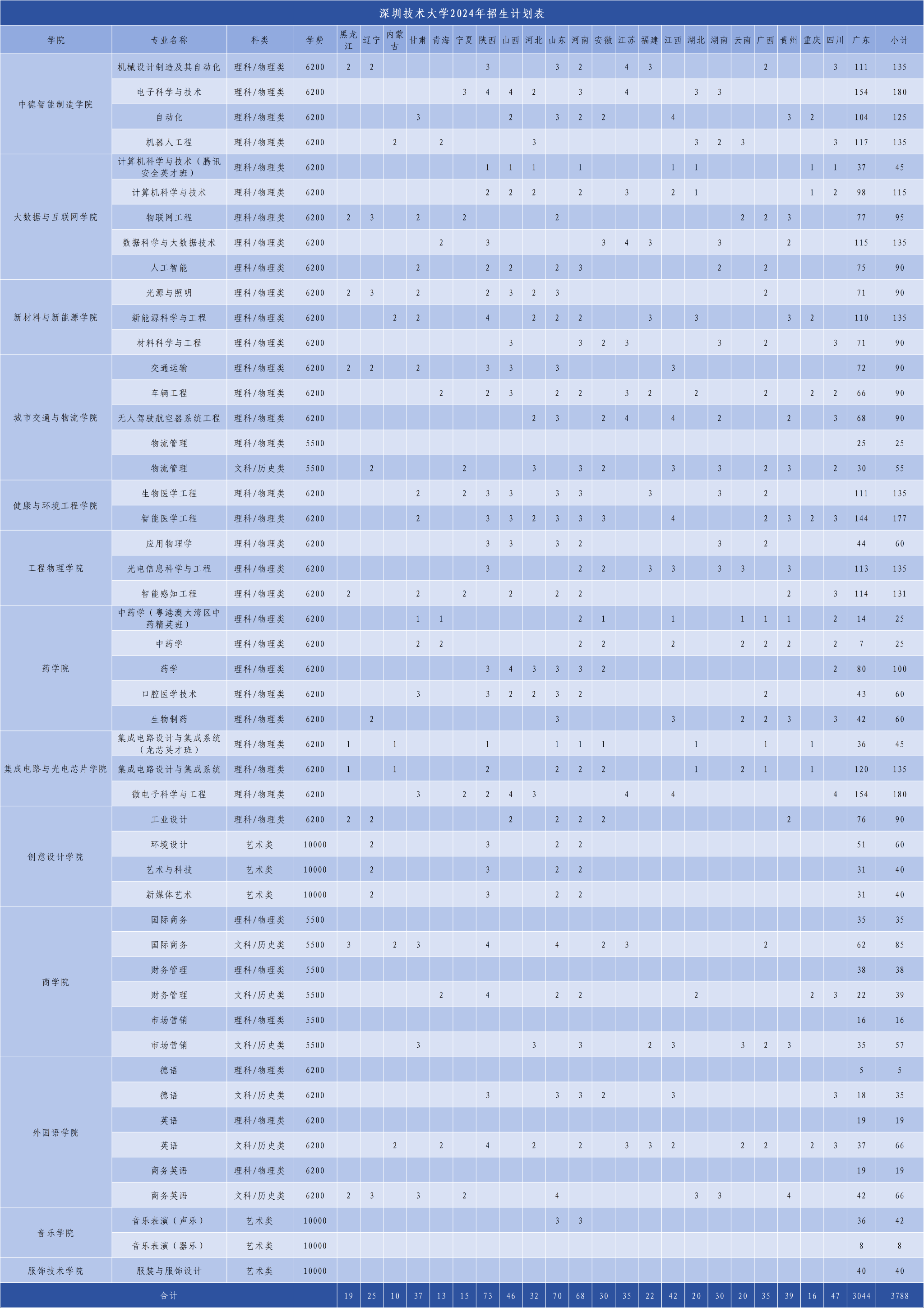 深圳技术大学2024年计划面向广东、黑龙江、辽宁、内蒙古、甘肃、青海、宁夏、陕西、山西、河北、山东、河南、安徽、江苏、福建、江西、湖北、湖南、云南、广西、贵州、重庆、四川等23个省份招生,计划招生3827人。