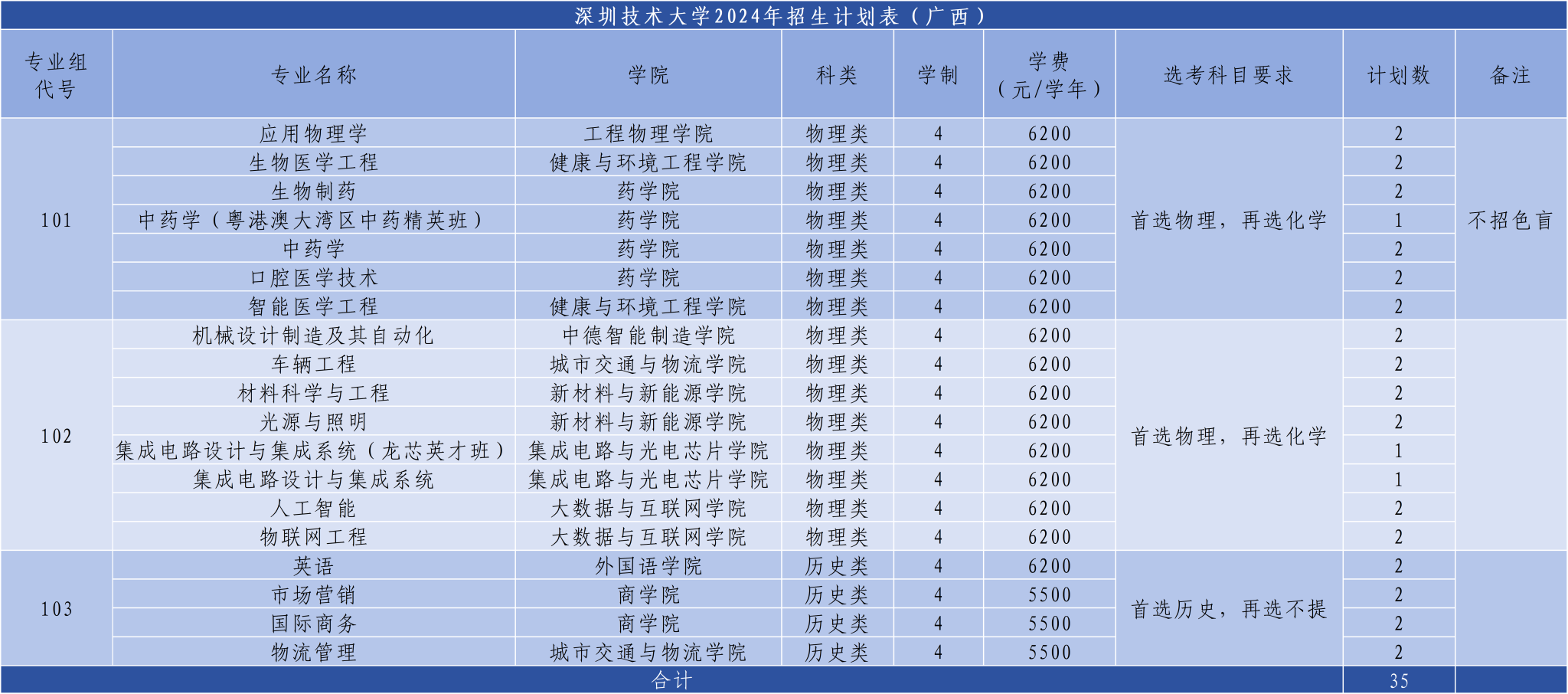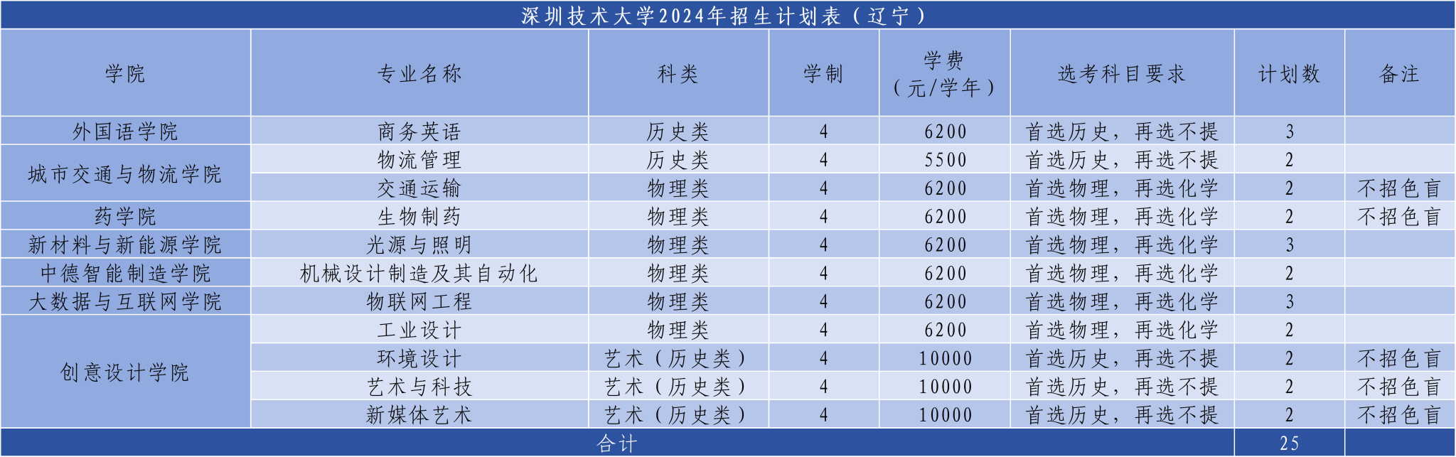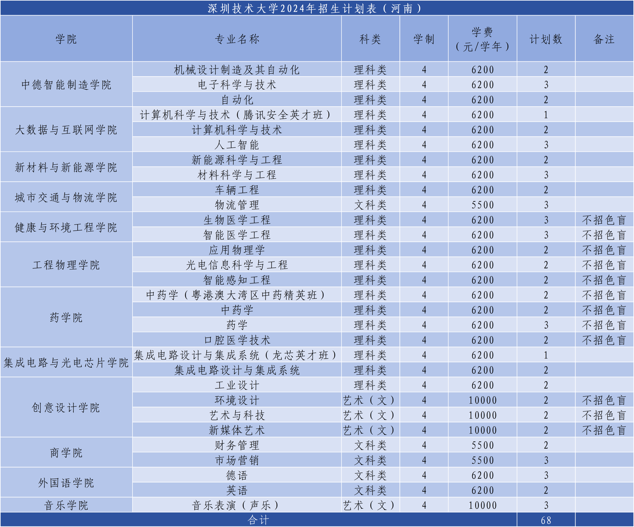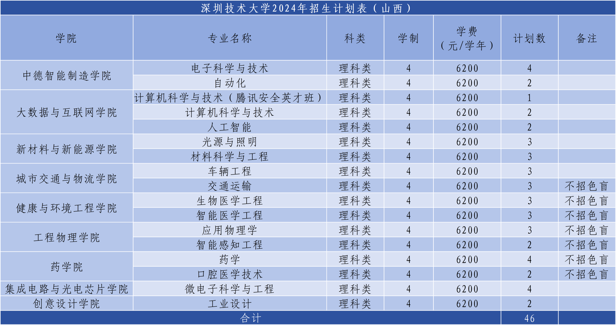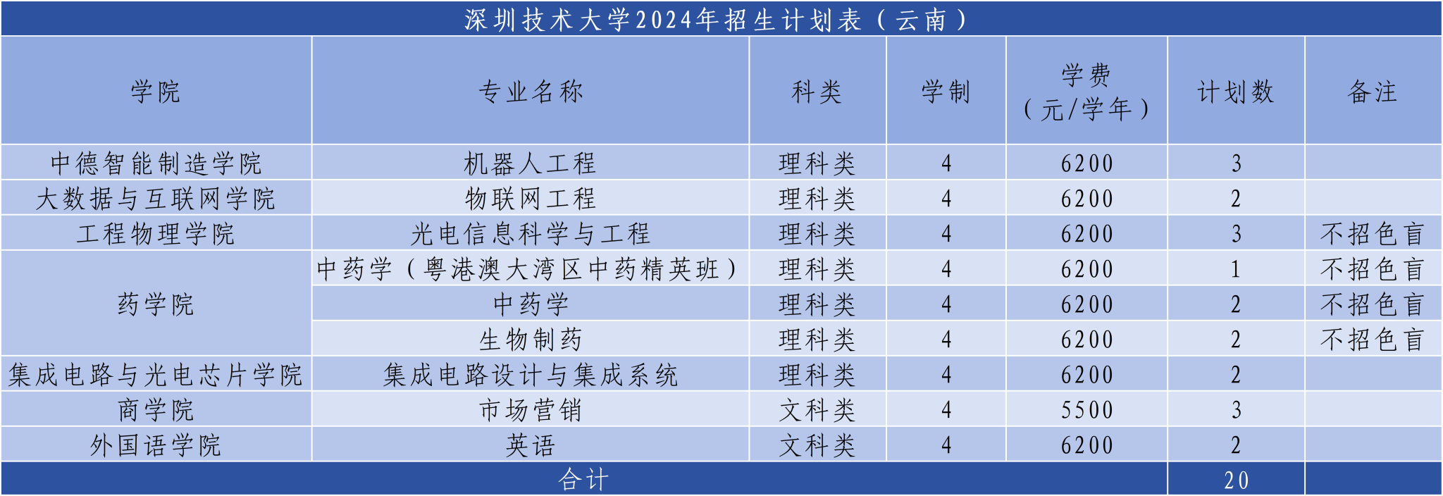 4.交通运输、生物医学工程、智能医学工程、应用物理学、光电信息科学与工程、智能感知工程、药学、中药学、口腔医学技术、生物制药、艺术与科技、环境设计、新媒体艺术、服装与服饰设计专业不招色盲。