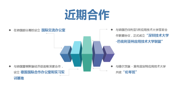 答:构建融入全球教育创新的国际合作新体系是深技大办学特色之一,学校目前已与德国、瑞士等国家40余所高校和机构建立合作关系,积极推进学院共建、实验室共建、学术交流、联合培养学生等多种形式的深度合作。
