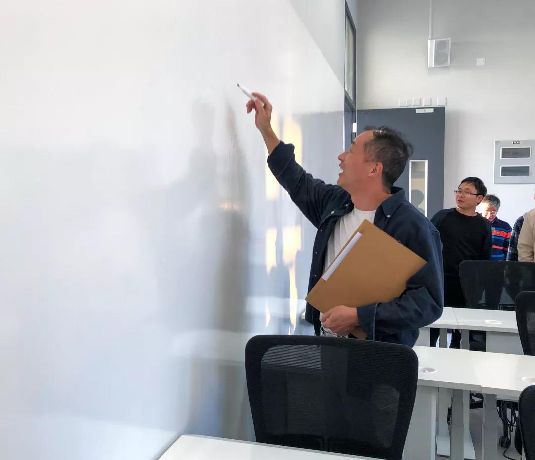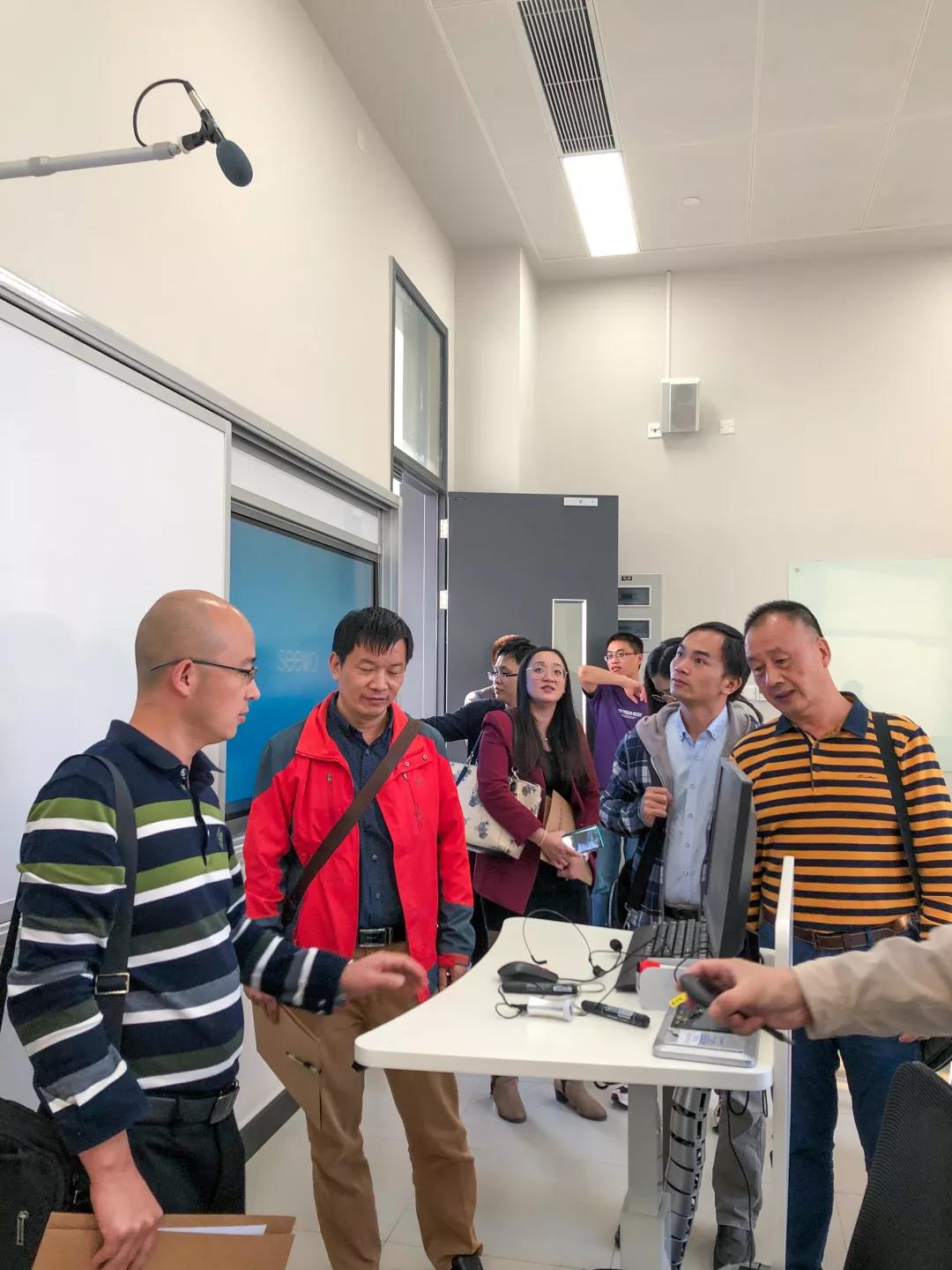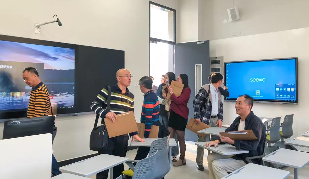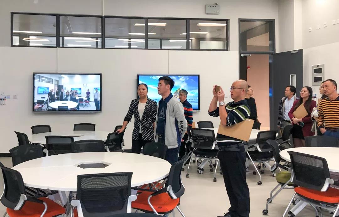 招生办和教务部工作人员为他们介绍了教学楼内纳米墙、吊麦、一体机、活动桌椅、电力导轨等设备,他们对深技大智慧教室给予高度评价。