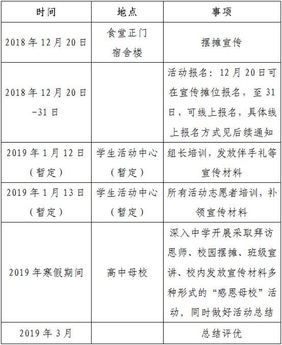 敲重点了!敲重点了!2019年第二届“感恩母校”寒假宣传活动安排详见下表。