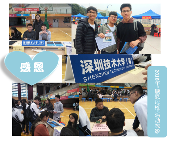 “感恩母校”活动由招生办公室组织策划,学生社团“学长团”负责执行的志愿招生宣传活动,旨在鼓励在校学生利用寒假假期时间返回其母校开展感恩母校高中、宣传大学的活动。2019年深圳技术大学(筹)第二届“感恩母校”活动拟于2018年12月开启。