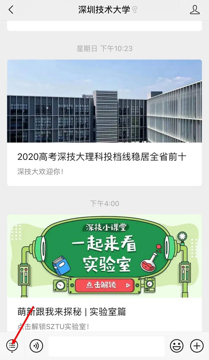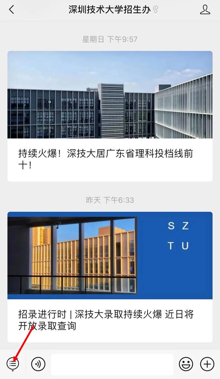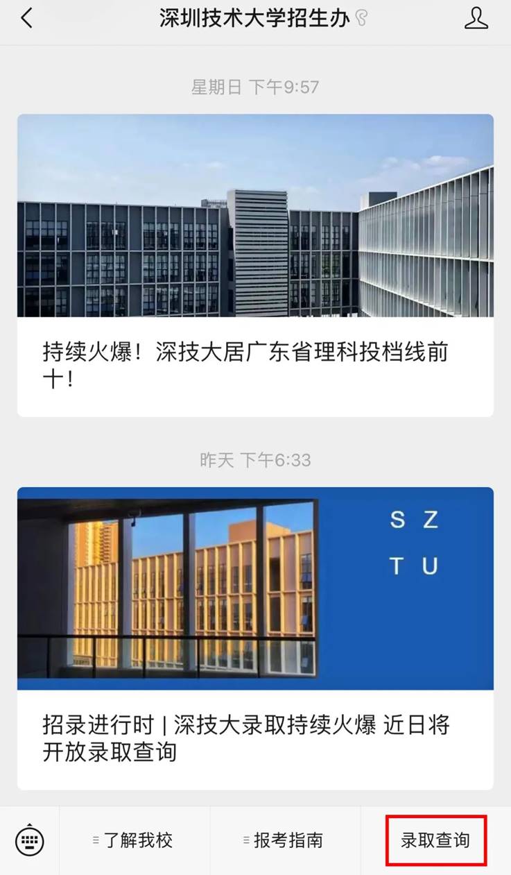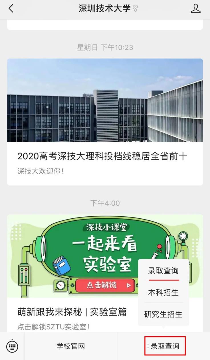 除了网页,我们在深圳技术大学招生办及深圳技术大学的官方微信公众号也设置了查询跳转通道。具体查询方法如下(以手机端为例):