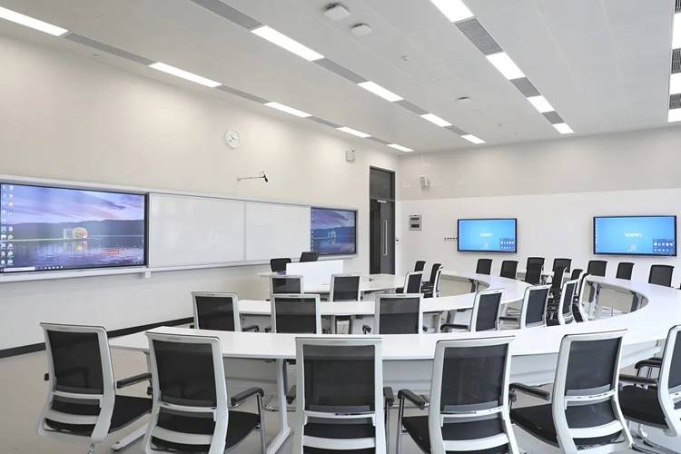 公共教学楼共有44个智慧教室,配置电力导轨、吊麦、单片机、活动桌椅、搪瓷黑板等,突破时空限制给大家带来不一样的教学体验,用科技为教学加分。