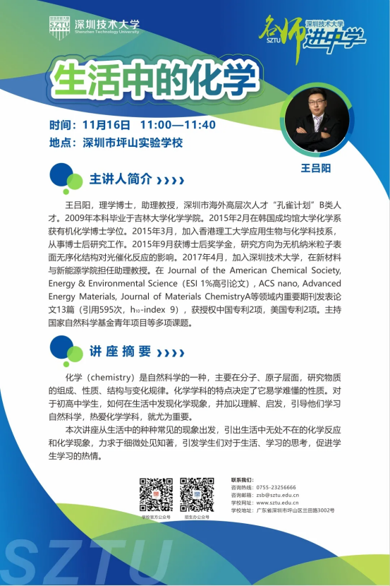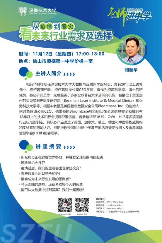 深圳技术大学将于11月12日、11月16日分别走进佛山市第一中学、深圳市坪山实验学校开展名师进中学讲座,具体时间地点如下: