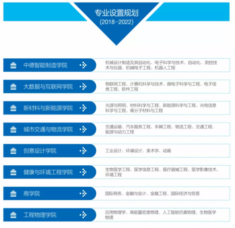 学校着力建设以面向国家和地方发展需要的工学为主、理学、管理学和艺术学等协调发展的学科体系,分步发展和优化学科布局。初建阶段逐步设立机械设计制造及其自动化、光源与照明、物联网工程、交通运输、汽车服务工程、工业设计、生物医学工程、电子科学与技术、新能源科学与工程、国际商务、计算机科学与技术、材料科学与工程、自动化、应用物理学、环境设计等高度契合经济发展和产业需求的专业。