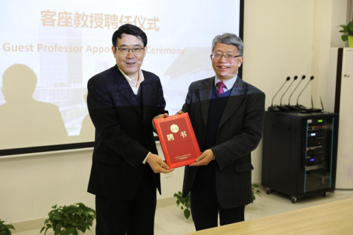 丁永健教授接过深圳技术大学主任阮双琛颁发的荣誉聘书,受聘为深圳技术大学客座教授