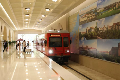 最后一站,中瑞师生们满怀期待来到了华为东莞松山湖总部基地,华为斥资100亿元建造,是华为最重要的研发部和通信部所在地。该基地于2014年9月动工,2018年7月投入使用,欧式古堡的建筑鳞次栉比,美丽的绿化随处可见,山水环绕,安静怡人,宛如世外桃源。该基地共有12个区,已交付的园区有8个,分别是E区格拉纳达、F区巴黎、G区维罗纳、H区克伦诺夫、J区瑞士弗里堡、K区法国勃艮第、L区海德尔堡、M区博洛尼亚。每个欧洲小镇之间有华为的电轨小火车连接,不出国门就可以“环游”欧洲。充满欧式风格的古堡使深技大学子与瑞士师生流连忘返,就连来自欧洲的小伙伴们也对矗立的建筑赞不绝口。