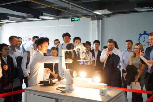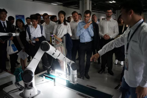 接着,中瑞师生来到大族机器人有限公司,刚踏进大门便见墙上写着公司的使命:“推动机器人服务于各行各业,解放人民的双手,最终服务全人类。”看得学生们热血沸腾,激起了浓烈兴趣 。讲解员带领中瑞师生们共同观摩了Elfin系列协作机器人、HM水平多关节机械手、Star机器人、Cute系列机械臂等产品和操作流程。