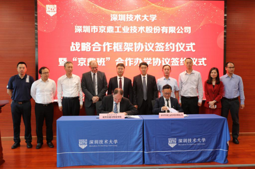 4月23日,深圳技术大学与深圳市京鼎工业技术股份有限公司在我校启动校区举行了战略合作框架协议签约仪式暨“京鼎班”合作办学协议签约仪式,以及客座教授聘任仪式。深圳技术大学主任阮双琛、坪山区副区长陈华平以及深圳市京鼎工业技术股份有限公司董事长黄志强等出席仪式。