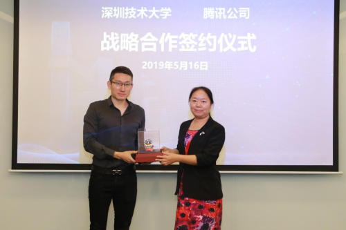 腾讯副总裁邱跃鹏向深技大副主任张岩鸿赠送纪念品