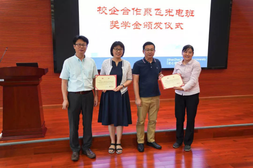 2017年成立的聚飞光电班作为深圳技术大学第一个校企合作班,创新了校企之间的合作模式,打通了校企之间的合作渠道。6月11日下午,深圳技术大学新材料与新能源学院举行聚飞光电班奖学金颁奖仪式,来自2017级7位聚飞光电班的同学们获得了聚飞公司颁发的奖学金及荣誉证书。深圳技术大学副主任徐刚、科研与校企合作部主任杜晨林、教务处兼招生办主任刘宏伟,新材料与新能源学院院长韩培刚、副院长仇明侠及柴广跃教授等学院领导、教师,聚飞光电公司总经理高四清、技术中心总经理孙平如、人力资源总监黄明等出席仪式。仪式由新材料与新能源学院院长韩培刚主持。