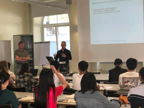 随后,在国际关系部负责人Peter Eigenmann教授的引导下,中瑞学生开始展开“破冰”活动,根据分组名单,大家互相找到了各自配对的搭档,并通过总结复述搭档的自我介绍,促进中瑞学生彼此间的相互认识、加深了解。此外,Peter教授还通过引用实际例子详细介绍了文化维度、跨文化交流技巧和多元化重要性等概念。