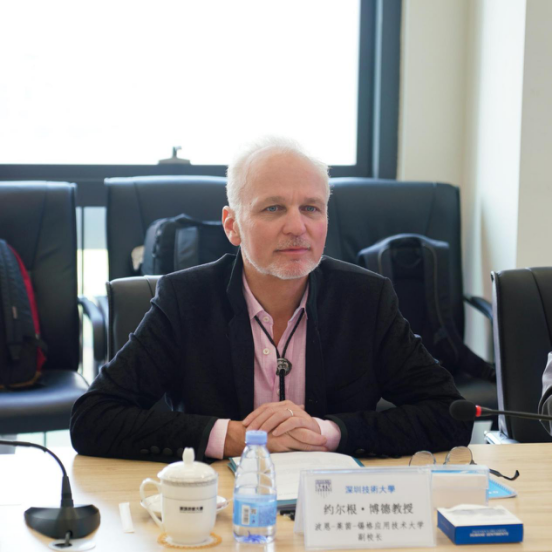 Bode副校长在波恩-莱茵-锡格应用技术大学负责国际事务,今年内已是第二次来访我校。他表示,深圳技术大学的飞速发展让他印象深刻,短短半年多的时间,大家已搬入环境优美的校园里工作学习,校园建设的“深圳速度”令人惊叹。Bode副校长此次与同为波恩-莱茵-锡格应用技术大学执行委员会成员的两位副校长及该校最具规模的研究所负责人一同前来,希望与深技大在联合办学、联合科研及技术转移等三个方面开展合作,进一步推动学生合作交流。未来希望与深技大商学院、健康与环境工程学院等学院加强合作,逐步开设学生交流交换甚至2+2学生联合培养项目。此外,他表示,波恩-莱茵-锡格应用技术大学对深技大国际周项目兴趣浓厚,希望明年能够加入进来,将德国波恩莱茵地区特色项目——狂欢节带入国际周。