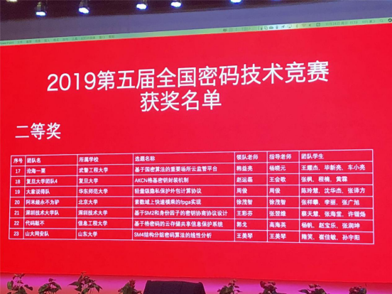 本次比赛,来自北京大学、清华大学、复旦大学等全国74所高校的357支队伍参赛,深圳技术大学首次组队参加这一全国密码大赛,经几轮激烈比拼,最终获得二等奖。11月24日,颁奖典礼在北京邮电大学科技会堂举行,中国工程院院士蔡吉人,中国科学院院士王小云,国家密码管理局及中国密码学会相关领导等依次为获奖团队颁奖。
