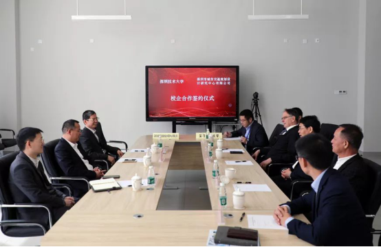 2019年12月6日,深圳技术大学与深圳市城市交通规划设计研究中心(以下称“深圳交通中心”)在深技大公共教学楼举行了战略合作框架协议签约仪式。深圳交通中心主任、党委书记张晓春,技术总监李锋,行政法务部部长陆洋,深圳技术大学校长阮双琛,副主任徐刚,科研与校企合作部主任杜晨林,城市交通与物流学院院长Franz Raps,交通运输工程系主任罗钦等出席。签约仪式由深技大副主任徐刚主持。