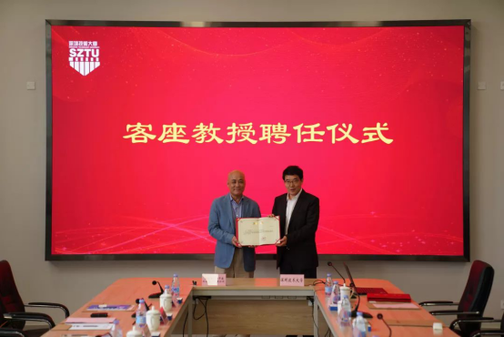 签约仪式后,深圳技术大学校长阮双琛为深圳市华云中盛科技股份有限公司董事长李小勇颁发聘书,受聘其为深圳技术大学客座教授,将不定期为深技大学子讲授专业课程。