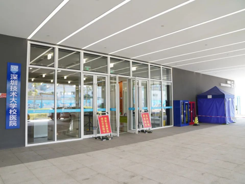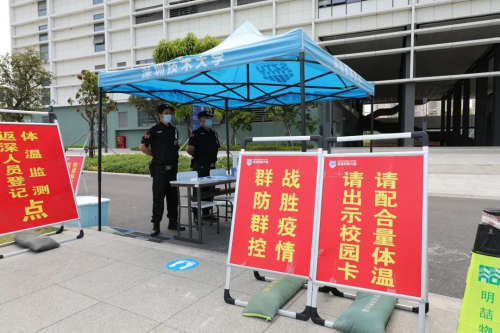 校园内各建筑入口均设有深技大针对疫情自主研发的红外热像测温仪,采取非接触式测温,充分满足校园测温需求。