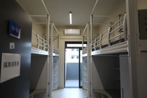 学校在北区E-2学生宿舍14至16层设立了超100间健康观察隔离单人间,并配备了日常生活用品。该区域使用独立的专用电梯,电梯采用脚踏式按键。