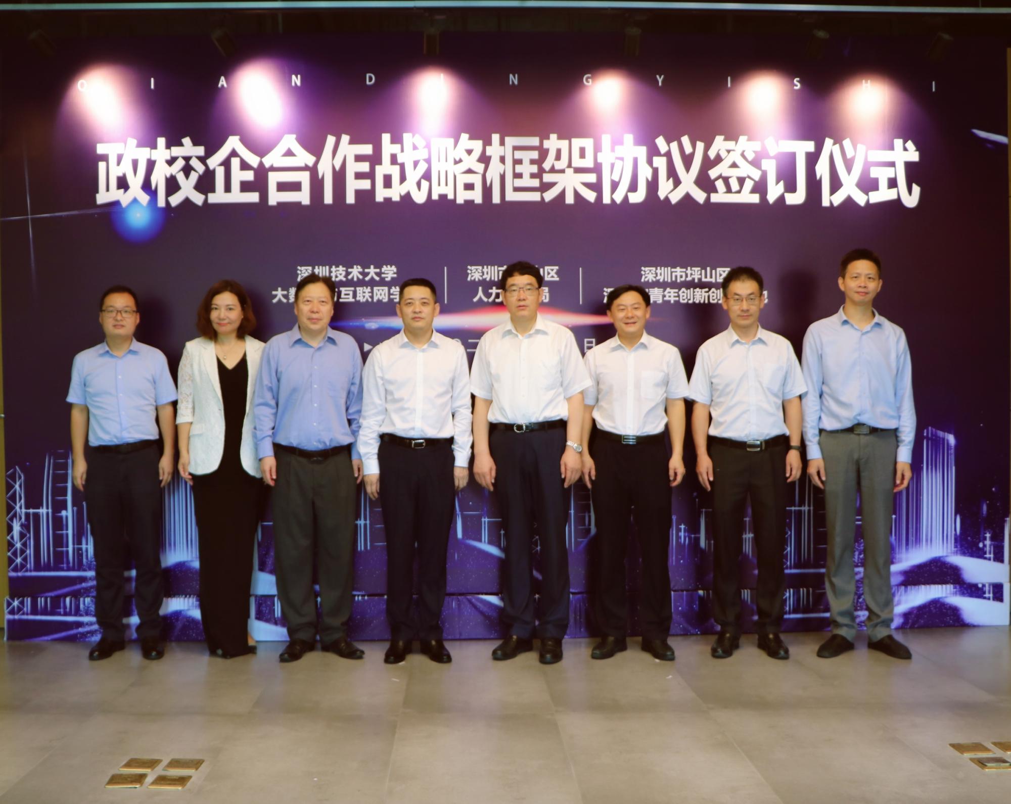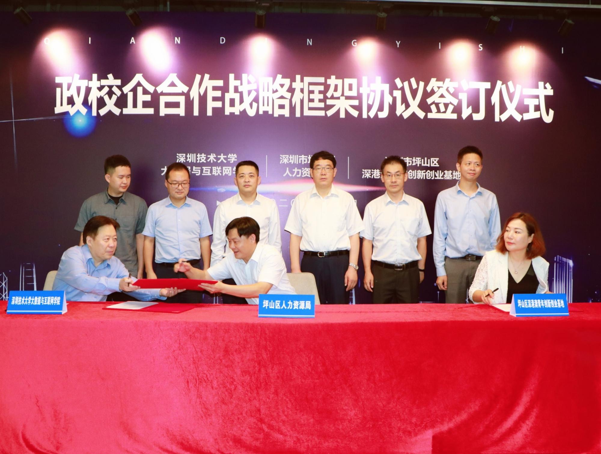 7月8日上午,深圳技术大学大数据与互联网学院、坪山区人力资源局、坪山区深港澳青年创新创业基地三方共同签署战略合作框架协议,正式启动政校企合作。深圳技术大学校长阮双琛,坪山区委常委、统战部部长李广明等共同出席项目签约仪式。