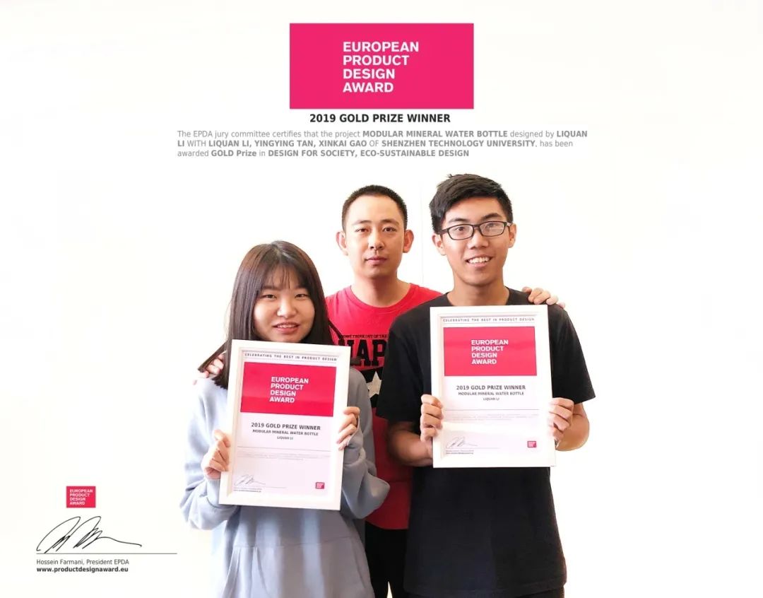 创意设计学院师生设计团队拿下欧洲产品设计奖(EPDA)金奖:由深技大创意设计学院青年教师李立全和2018级工业设计专业学生谈莹盈、高新凯组成的师生设计团队的《基于可持续发展理念的模块化包装瓶设计》以排位第三的成绩荣获了2019年度EPDA设计奖金奖。