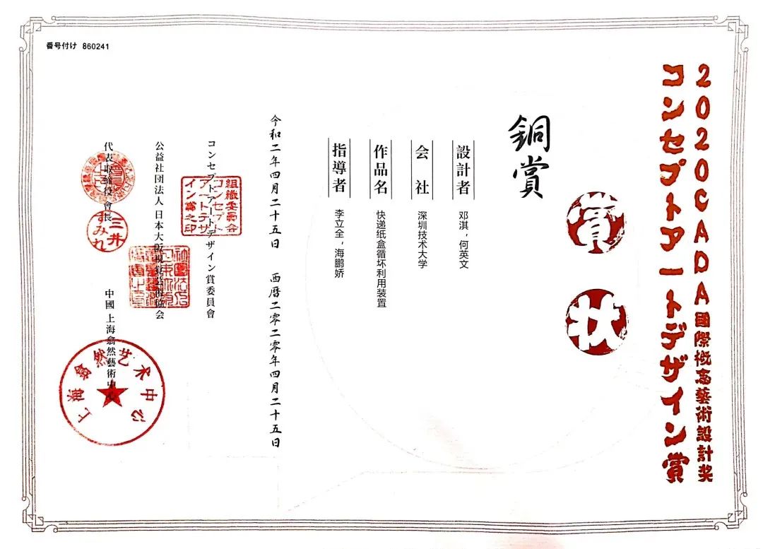 深技大学子喜获日本 2020 CADA 国际概念艺术设计大奖:由创意设计学院李立全、海鹏娇老师指导的两个学生团队的三项设计作品拿下日本“2020 CADA国际概念艺术设计奖”产品设计组铜奖,三项作品将报送日本参加总决选。