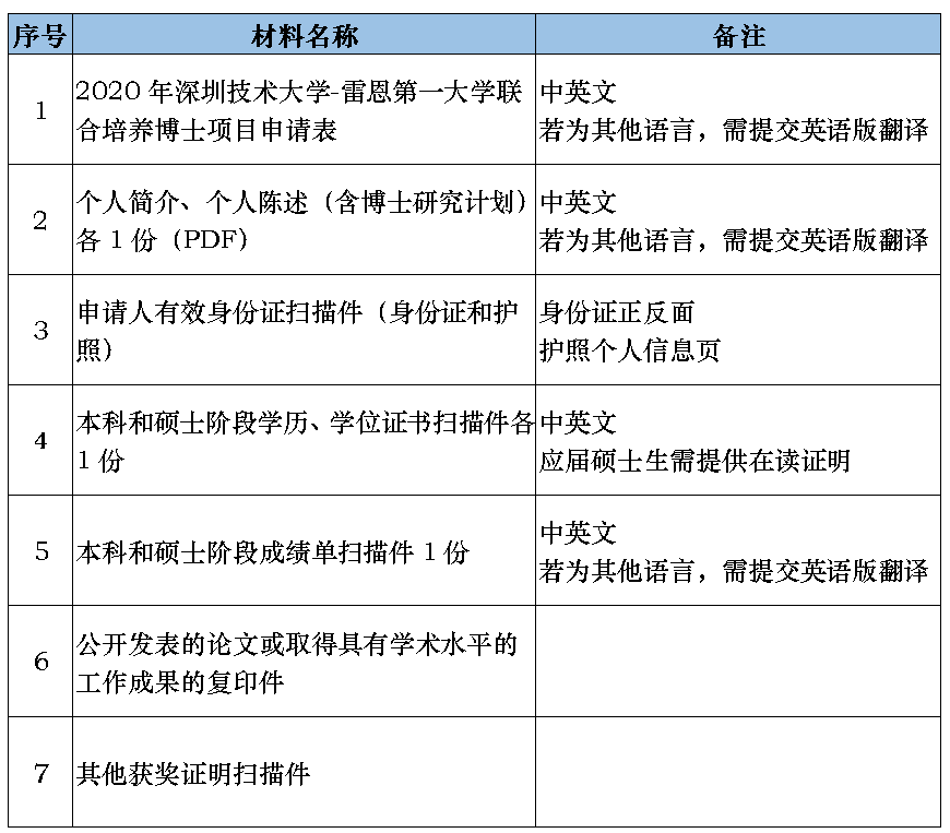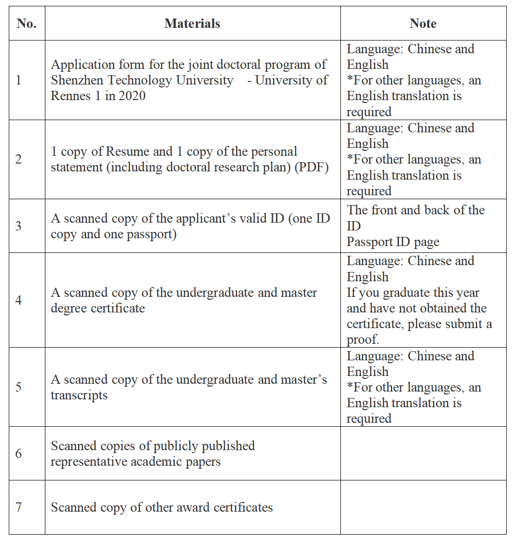 申请者须提交下述内容,文件须按下表顺序编号、命名后打包发送至邮箱:gra@sztu.edu.cn(邮件主题:申请者姓名+拟入学年份+深技大博士研究生项目申请)申请材料发送时间截止至2020年11月10日(雷恩第一大学将于12月中旬通知最终录取结果)。
