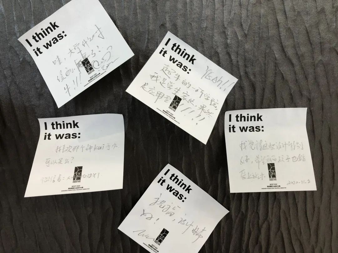 在精心设计的留言区-I think it was……的亚克力箱中不仅有人们对设计的思考,还有许多参观者留下的对深圳技术大学期待、鼓励、赞扬的文字。