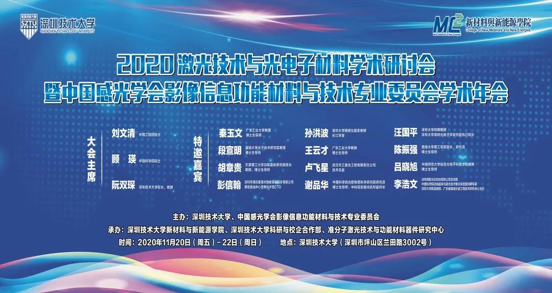 11月20日至22日,“2020激光技术与光电子材料学术研讨会暨中国感光学会影像信息功能材料与技术专业委员会学术年会”在深圳技术大学举办。本次大会由深圳技术大学、中国感光学会影像信息功能材料与技术专业委员会主办,深圳技术大学新材料与新能源学院、科研与校企合作部、准分子激光技术与功能材料研究中心承办。