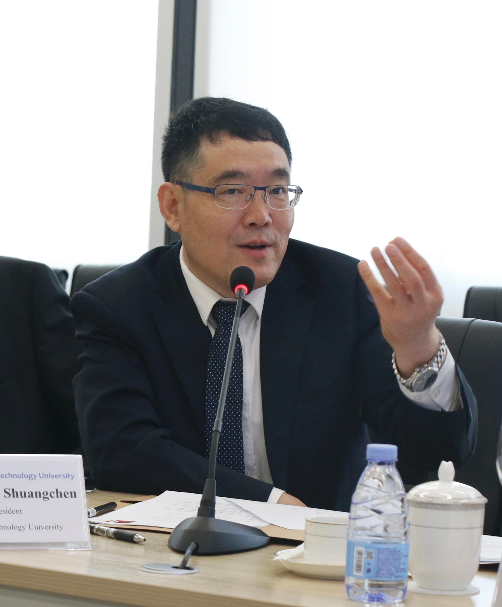 Poernbacher校长与深技大结缘已久,早在2017年他就以德国兰茨胡特应用技术大学电气工程与工业工程学院院长的身份受邀来访深技大,参加高水平应用技术大学论坛并作报告,同时受聘为我校客座教授。四年前的访问至今令他印象深刻,他对深圳技术大学的快速发展表示祝贺。作为兰茨胡特应用技术大学的校长,他希望自己在任期间能够推动学校的国际化进程,开设纯英文专业课程,并加入医药、媒体方面的新专业。他还表示,巴伐利亚州政府十分重视兰茨胡特应用技术大学的建设,坚持为学校提供必要的资金支持及学术自由度。他坚信两校的合作将有光明的未来。