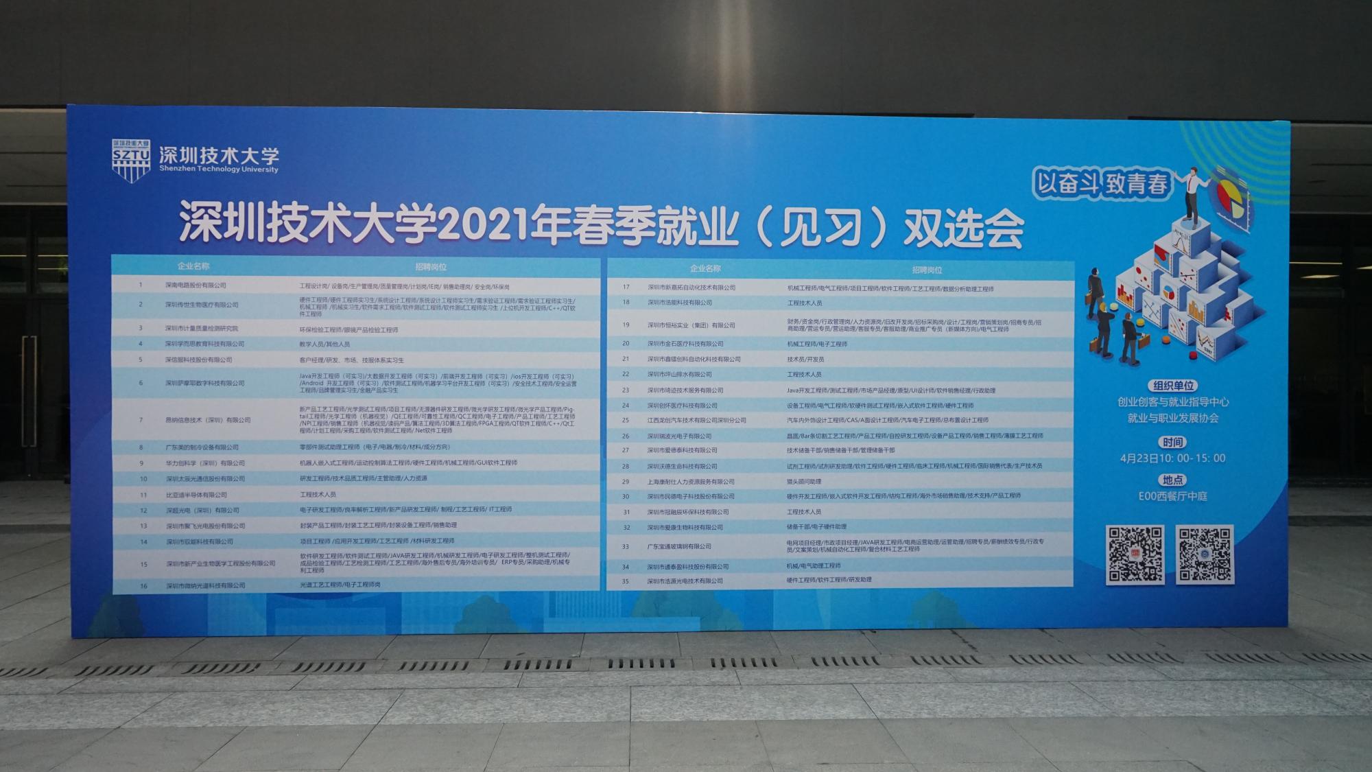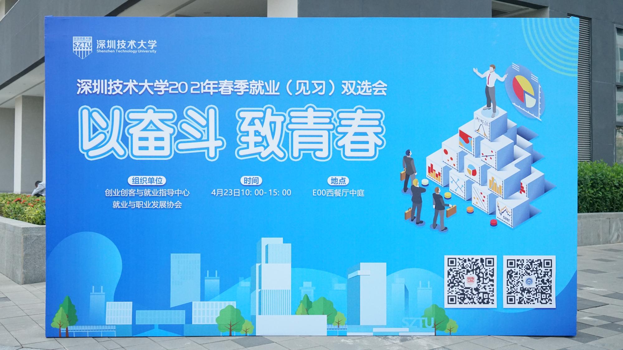 4月23日,深圳技术大学2021年春季就业(见习)双选会在E-00西餐厅中庭举行。本次双选会由学校创业创客与就业指导中心与就业与职业发展协会联合举办,旨在搭建学生与企业交流的平台,切实推动2021届毕业生就业工作,进一步拓宽我校学生的就业渠道。