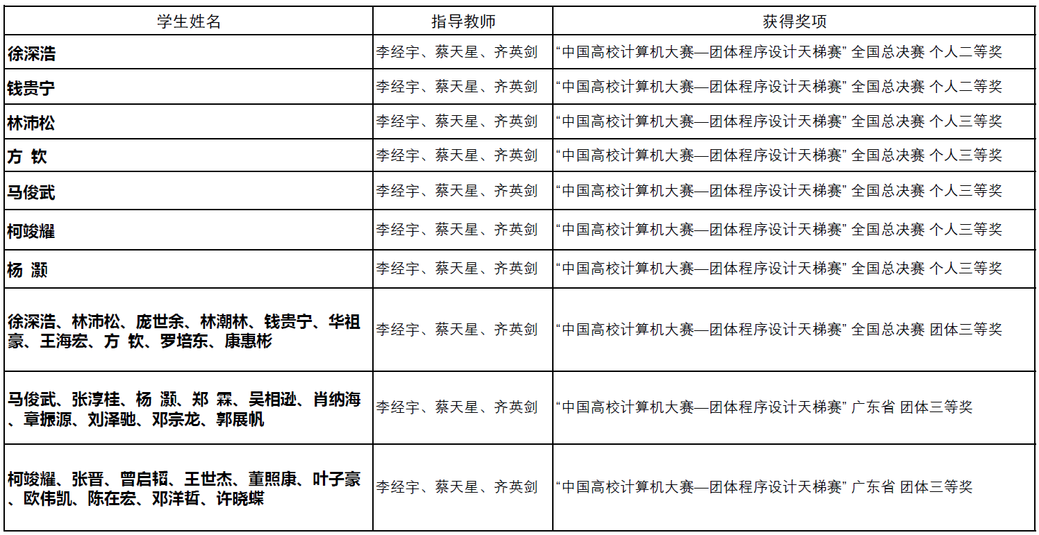 近日,2021年“第六届中国高校计算机大赛-团体程序设计天梯赛” 全国总决赛结果正式揭晓。深技大大数据与互联网学院参赛队伍获全国团队铜奖1项、全国个人二等奖2项、全国个人三等奖5项、广东省团队三等奖3项。