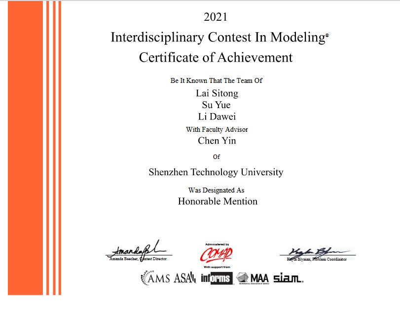 近日,2021年美国大学生数学建模竞赛和交叉学科建模竞赛(MCM/ICM)成绩揭晓,深技大大数据与互联网学院参赛队伍在竞赛中获国际二等奖(Honorable Mention)2项,成功参赛奖(Successful Participant)8项。这也是深技大首次派出学生参加国际数学建模竞赛。