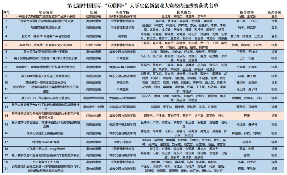 本次校内选拔赛自今年4月启动以来,共收集参赛项目101个,其中高教主赛道51个,红旅赛道50个,参赛学生551人次,参赛项目数是上届大赛的2.6倍。经资料初审、校赛网评、决赛答辩等一系列筛选,共有21个项目获奖。具体获奖名单如下: