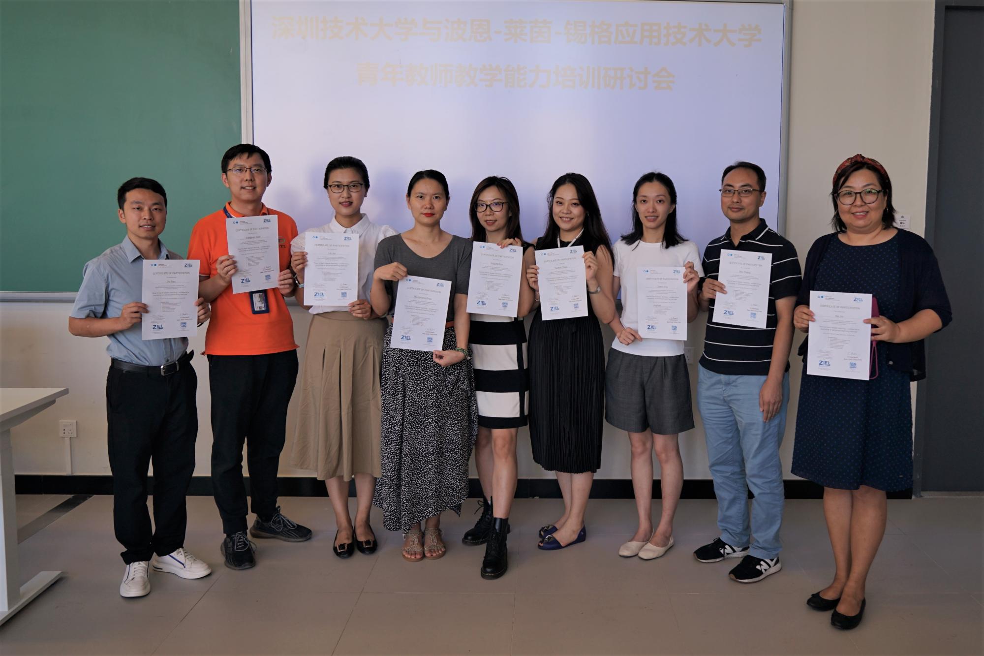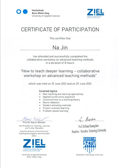 此次培训研讨会上,深技大18名教师分为3个小组,每组6名教师,分别在不同会场参加线上研讨,培训结束后获得由阮双琛校长与Marco Winzker副校长签署的培训证书。