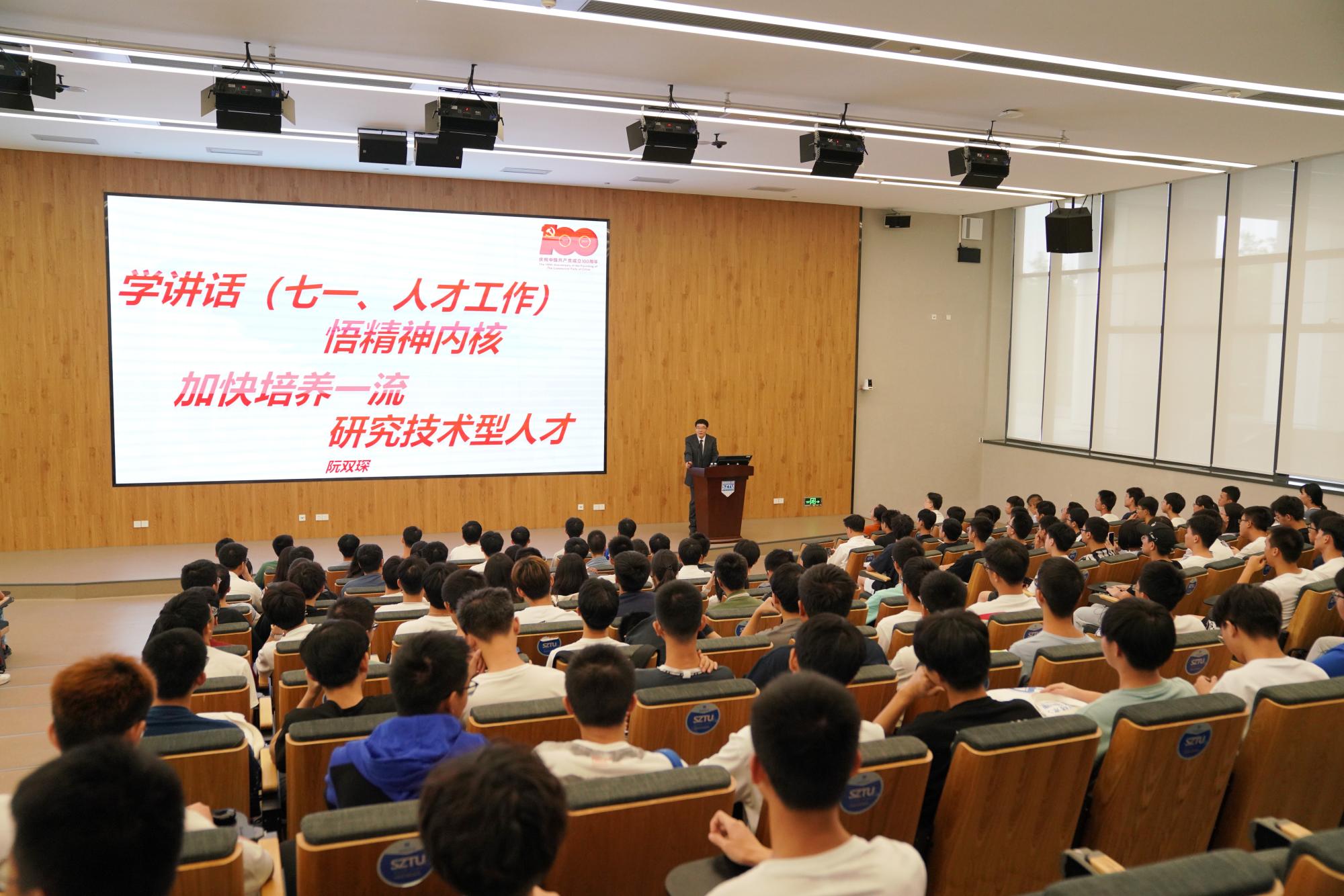 阮双琛紧紧围绕“为党育人、为国育才”这一主题,带领同学们回顾学习了习近平总书记“七一”重要讲话和习近平总书记在中央人才工作会议上的重要讲话精神,并从深圳技术大学的使命与担当、高等教育发展三大趋势等方面深入讲解,讲座精彩、内涵丰富,现场不时传出阵阵掌声。