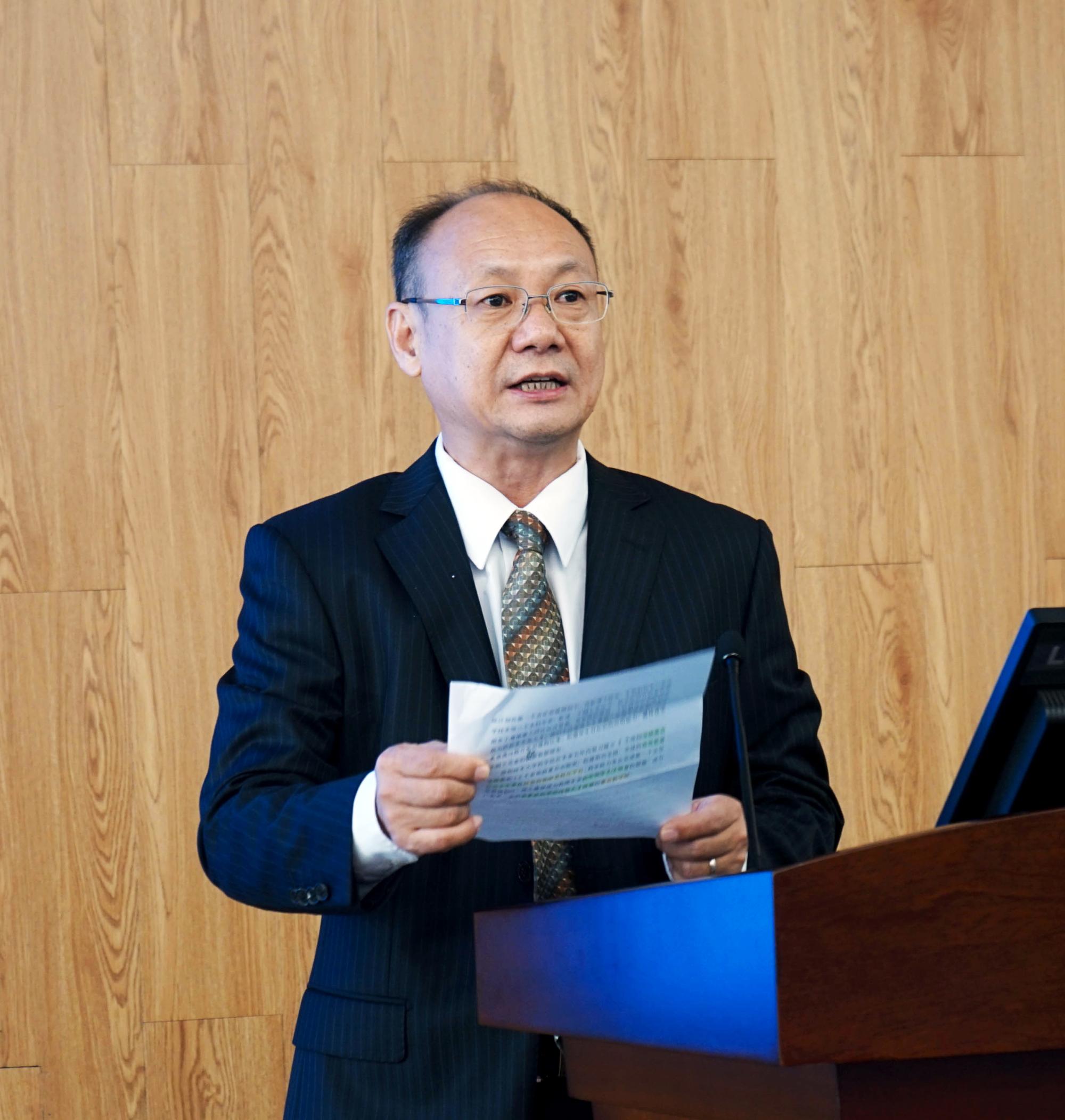 祥根生物科技有限公司行政部经理钟海媚代表公司向深圳技术大学药学院捐赠奖学金,药学院院长贺震旦上台接受捐赠。