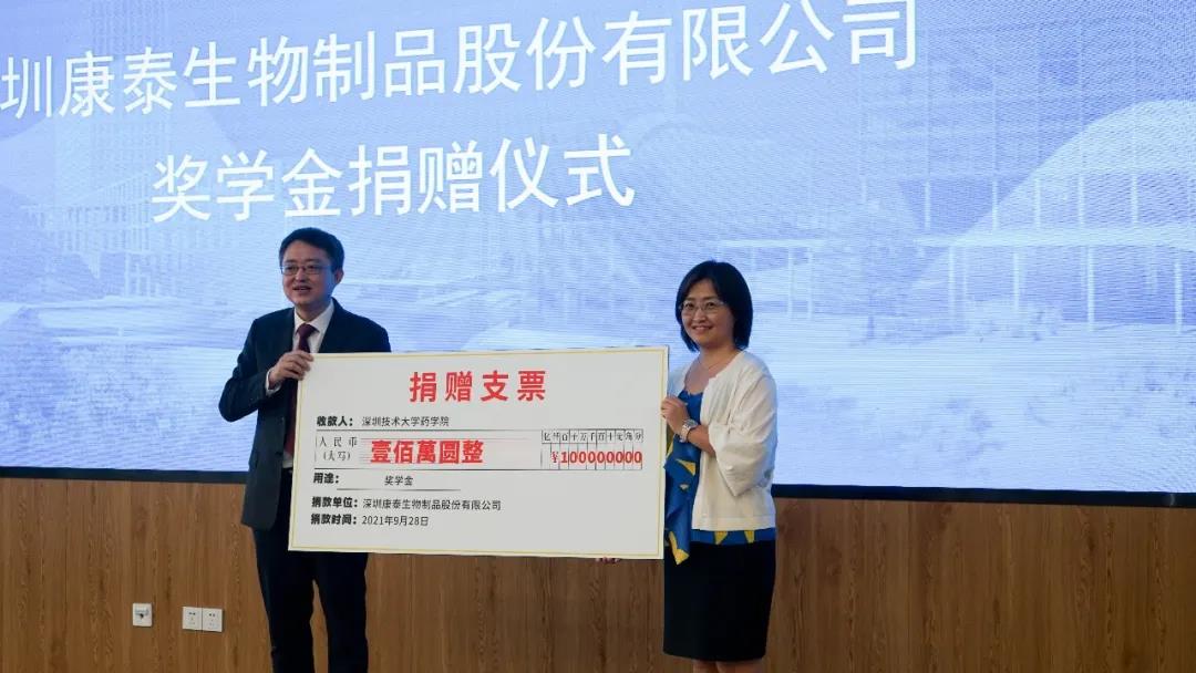 深圳康泰生物制品股份有限公司向深圳技术大学药学院捐赠奖学金一百万元。康泰生物成立于1992年,于2017年2月在深交所创业板上市,成为华南地区首个上市疫苗企业。成立30年来,康泰生物已经发展成为研发品种齐全、产品线丰富、技术优势明显的高新技术企业。已累计生产、销售了12亿多剂疫苗,帮助4亿多人免受乙肝病毒的侵害,为国家减少公共卫生支出超过1600亿元。