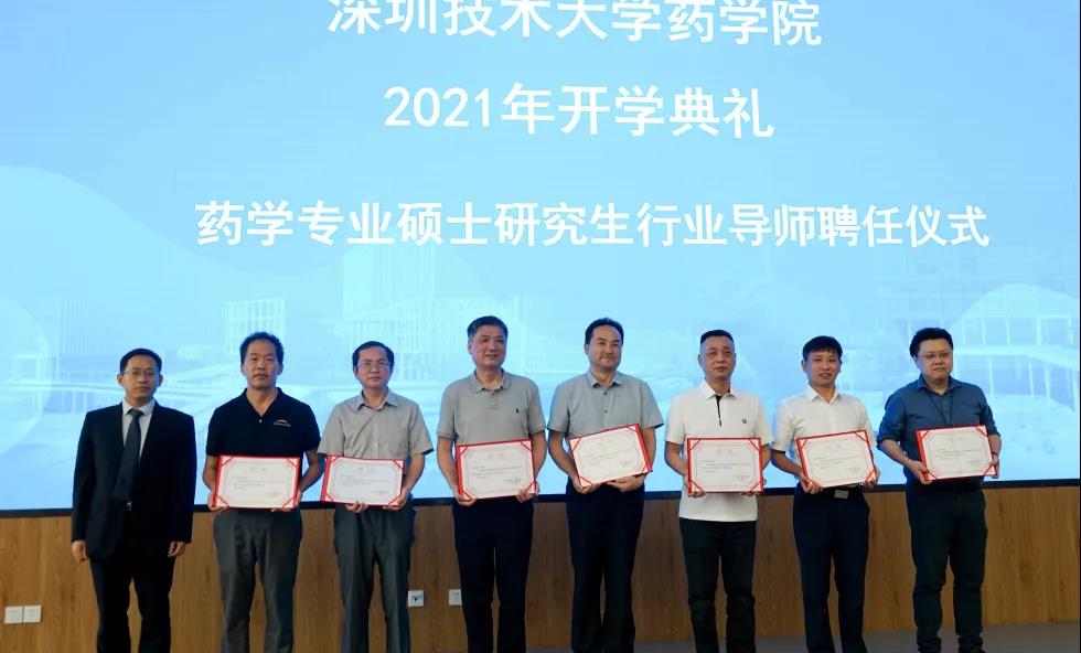 坪山区医药产业发展协会会长陈瑜、万乐药业有限公司总经理袁庆、深圳市中康福药业有限公司董事长唐贤敏、多微生保健食品有限公司董事长张义淦、深圳艾欣达伟医药科技有限公司副总裁蔡晓宏、科兴生物制药股份有限公司技术副总监柏江涛、天安骏业生物医药产业首席科学家白羽作为药学专业硕士行业导师代表上台,研究生院院长翟剑庞为他们颁发聘书。