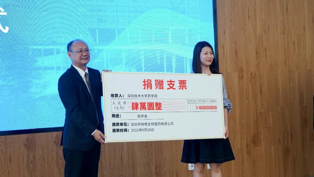 深圳市祥根生物科技有限公司向深圳技术大学药学院捐赠奖学金四万元。深圳市祥根生物科技有限公司于2008年12月成立,是一家集药物研发、生产、销售于一体的创新型医药高新科技企业,荣获“国家高新技术企业”“博士后实践创新基地”等称号。