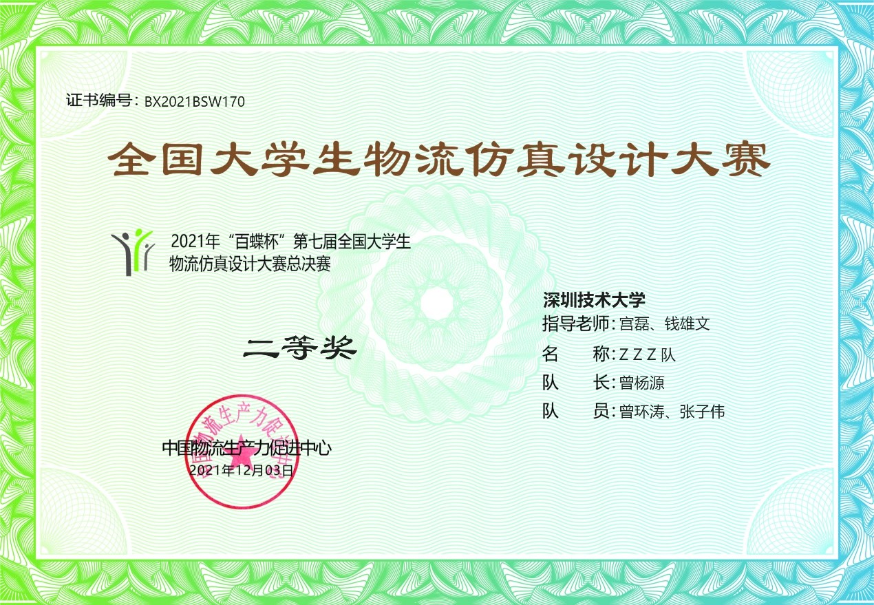 近日,我校城市交通与物流学院师生在全国及广东省物流竞赛中获得佳绩。由曾杨源、曾环涛、张子伟组成的“ZZZ队”获得2021年“百蝶杯”第七届全国大学生物流仿真设计大赛总决赛本科组二等奖,参赛队伍指导老师宫磊、钱雄文获得优秀指导教师奖。由邓泳忠、胡倚榕、关逸潼、江嘉慧组成的“穿梭机队”,林洁、蔡幸洳、蔡卓杰、陈春水组成的“WAB队”,李雪盈、刘可欣、陈煜琪、许佳楠组成的“风华队”分别获得2021年广东省“川流杯”供应链管理师职业技能竞赛本科组优秀奖;宫磊老师获得职工组个人优秀奖,我校获竞赛优秀组织奖。