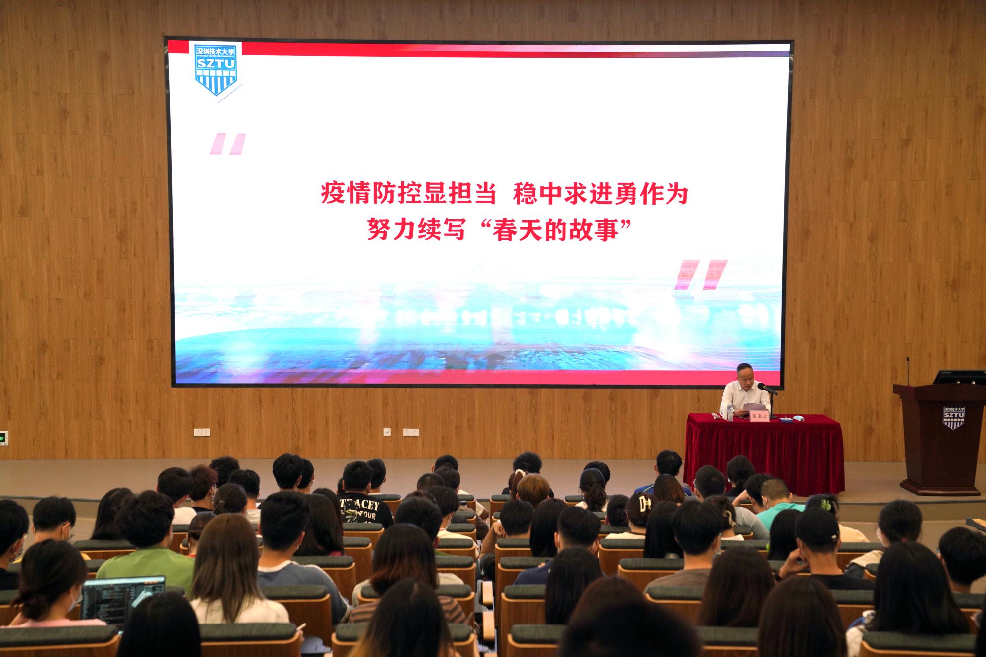 4月27日,深圳技术大学党委书记张基宏为学校师生讲授题为《疫情防控显担当 稳中求进勇作为 努力续写“春天的故事”》的思政第一课,以“稳字当头,稳中求进”工作主基调的背景和内在逻辑为切入点,带领师生共同回顾深圳今年抗击疫情的主要过程,讲述这场抗疫斗争带来的启示和精神力量。校党委副书记、纪委书记张岩鸿主持讲座。300余名学生、各单位党员代表、马克思主义学院教师等现场聆听了讲座。