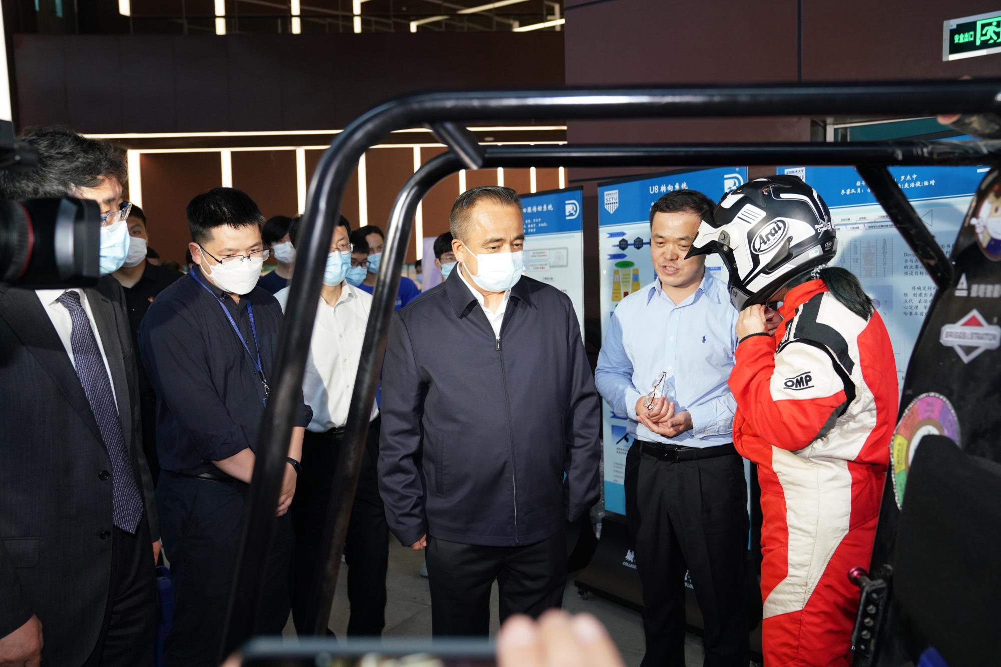 在深圳技术大学图书馆门前广场,城市交通与物流学院赛车工作室学生自制的巴哈赛车来回左右穿梭十分吸睛。代表团一行详细了解了这辆百公里加速仅需3.9秒的巴哈越野车及电动方程式赛车的相关情况,对学生自主设计制造的能力表示高度赞赏。