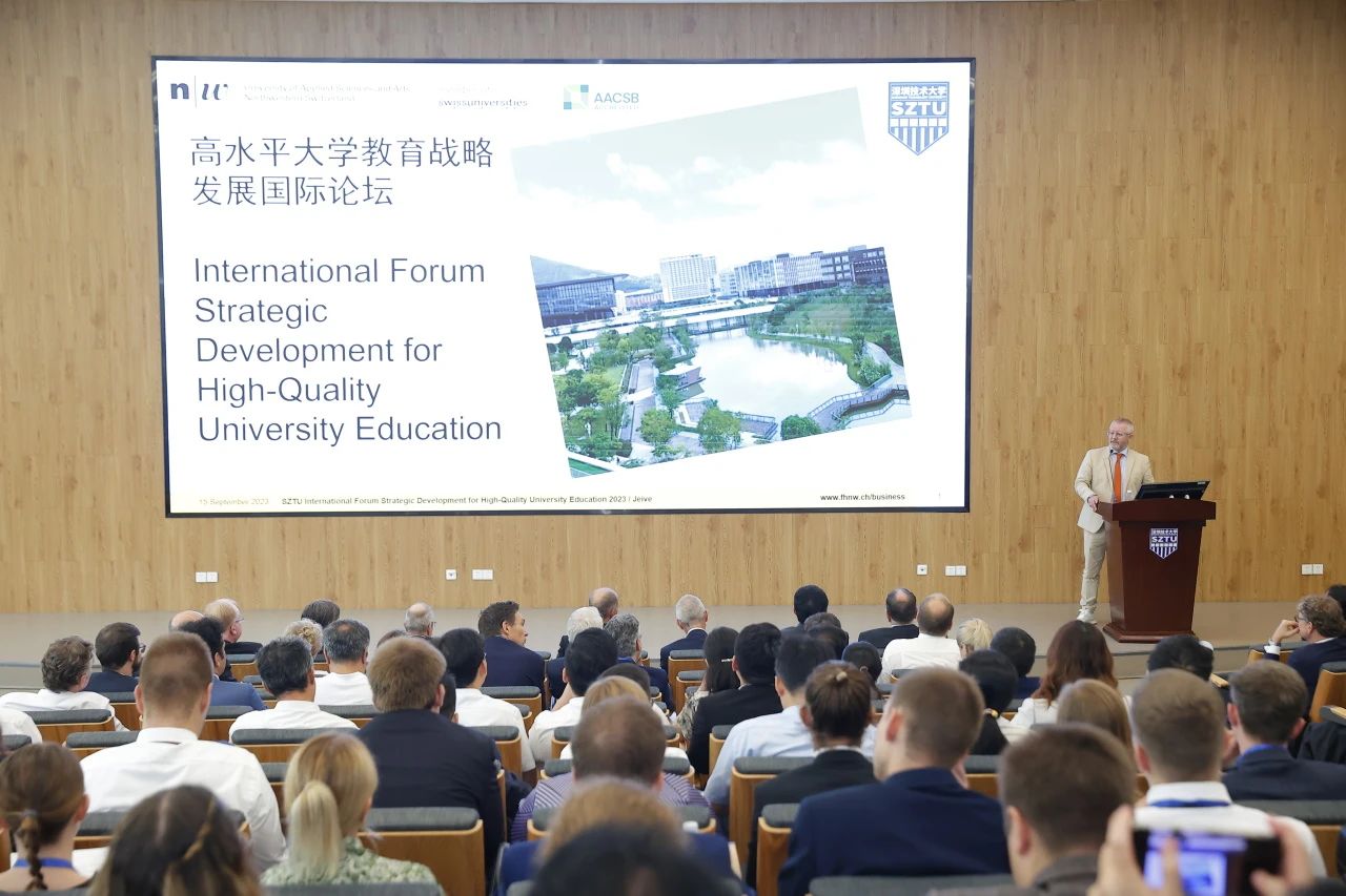 本次论坛主题为“高水平大学教育战略发展”,论坛邀请了奥地利因斯布鲁克管理中心校长安德鲁·阿尔特曼教授,德国维尔茨堡-施韦因富特应用科技大学校长罗伯特·盖尔布纳教授,瑞士西北应用科学与艺术大学商学院中国中心副主任迈克尔·杰夫教授,德国纽伦堡应用技术大学电气工程、精密工程与信息技术学院院长弗兰克·佩劳教授,德国东巴伐利亚应用技术大学(雷根斯堡)审计委员会主席英格·施特林教授,德国奥格斯堡应用技术大学商学院外事专员迈克尔·费希特教授,深圳技术大学校长阮双琛教授作主题演讲,深圳技术大学党委副书记、纪委书记张岩鸿,国际教学周来访国际师生及我校师生代表约270人参加论坛。