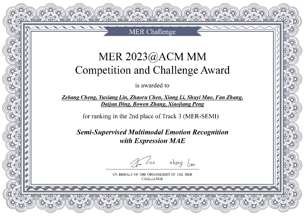 目前,深技大团队在比赛中使用的神经网络模型论文《Semi-Supervised Multimodal Emotion Recognition with Expression MAE》已被人工智能学术会议ACM MM 2023接收,并受邀在会议上作技术报告。